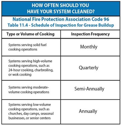 Commercial kitchens must maintain clean exhaust systems to reduce fire risk. The National Fire Protection Association (NFPA 96) outlines inspection and cleaning frequency based on cooking volume:
